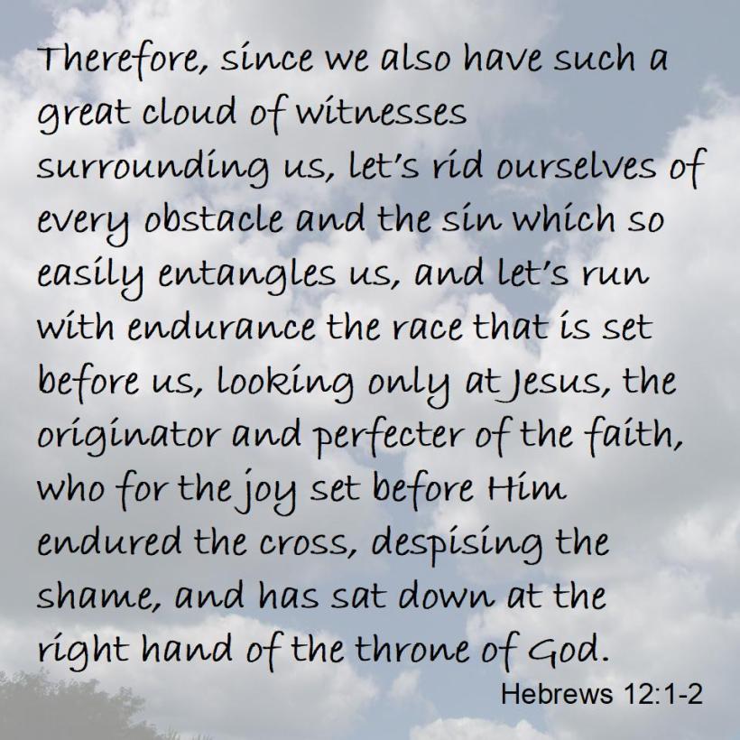 Dear Heavenly Father, thank You that Jesus endured the cross as an example of how we should endure. Please help us to look at the good examples You have provided and get rid of what distracts us from running the race You set for us. Please help us to look at Jesus continually.