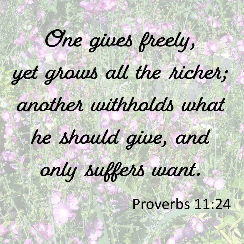 I chose verse 24 for my picture, because I think it gives an interesting idea. Too often after giving we feel depleted. I get it – I have been there. Unfortunately, some people decide to take too much and drain resources. If more of us chose to give freely, I think our resources would multiply instead of just subtracting.