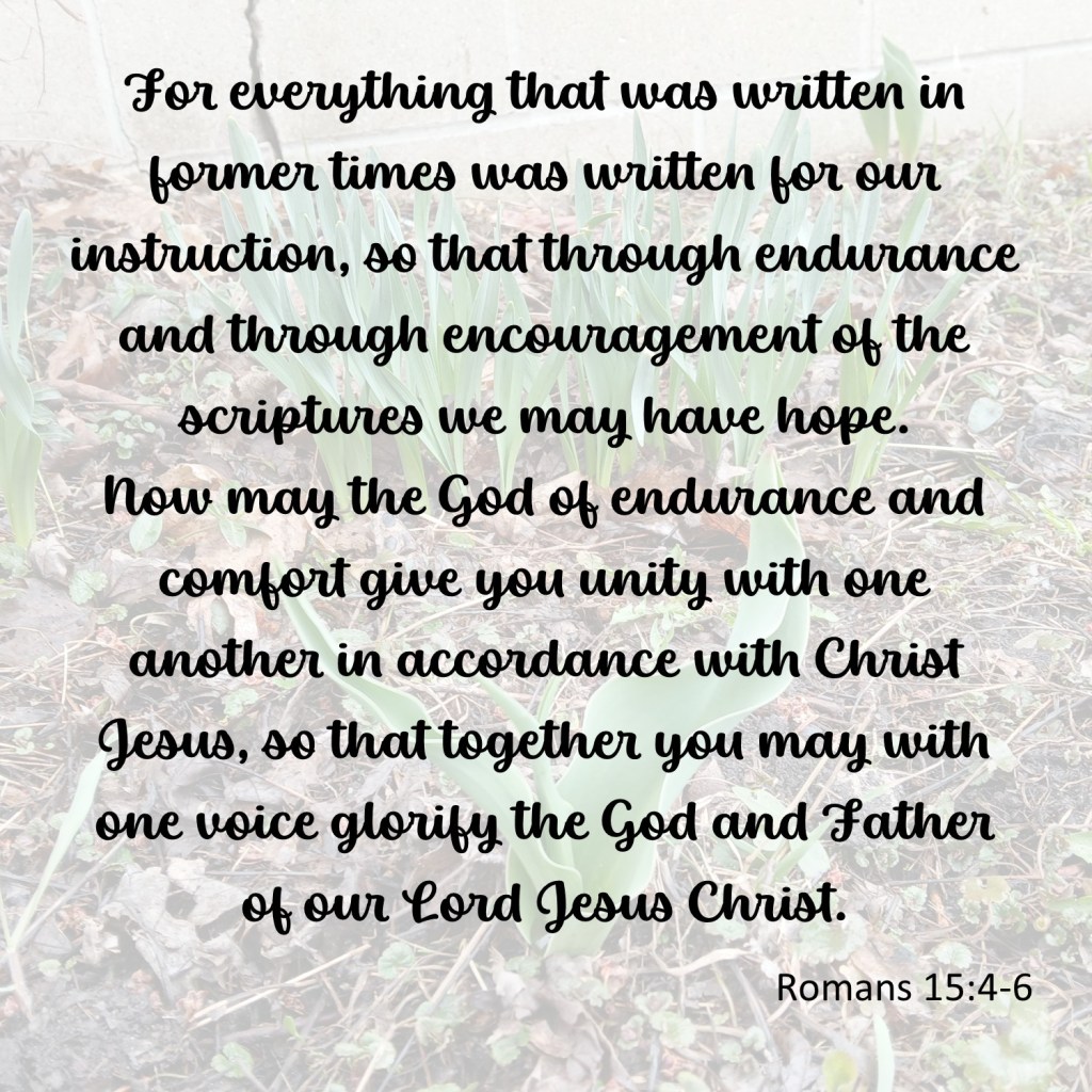 Dear Heavenly Father, thank You for the hope You have given in the Bible. Please help us to follow the instructions You give to receive the encouragement You promised. Please guide us to a unity that is “in accordance with Christ.” We need Your help. You deserve the glory.